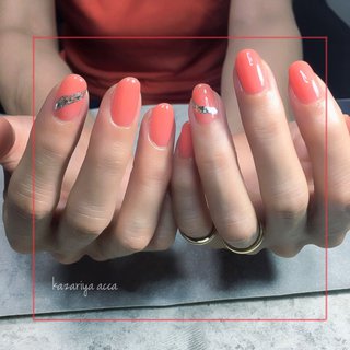 サーモンピンクのクリアワンカラー 春らしいカラーで可愛い オフィスにも最適です Aceamour ネイル セルフホワイトニング 所属 ネイル セルフホワイトニングのネイルデザイン ミニモ